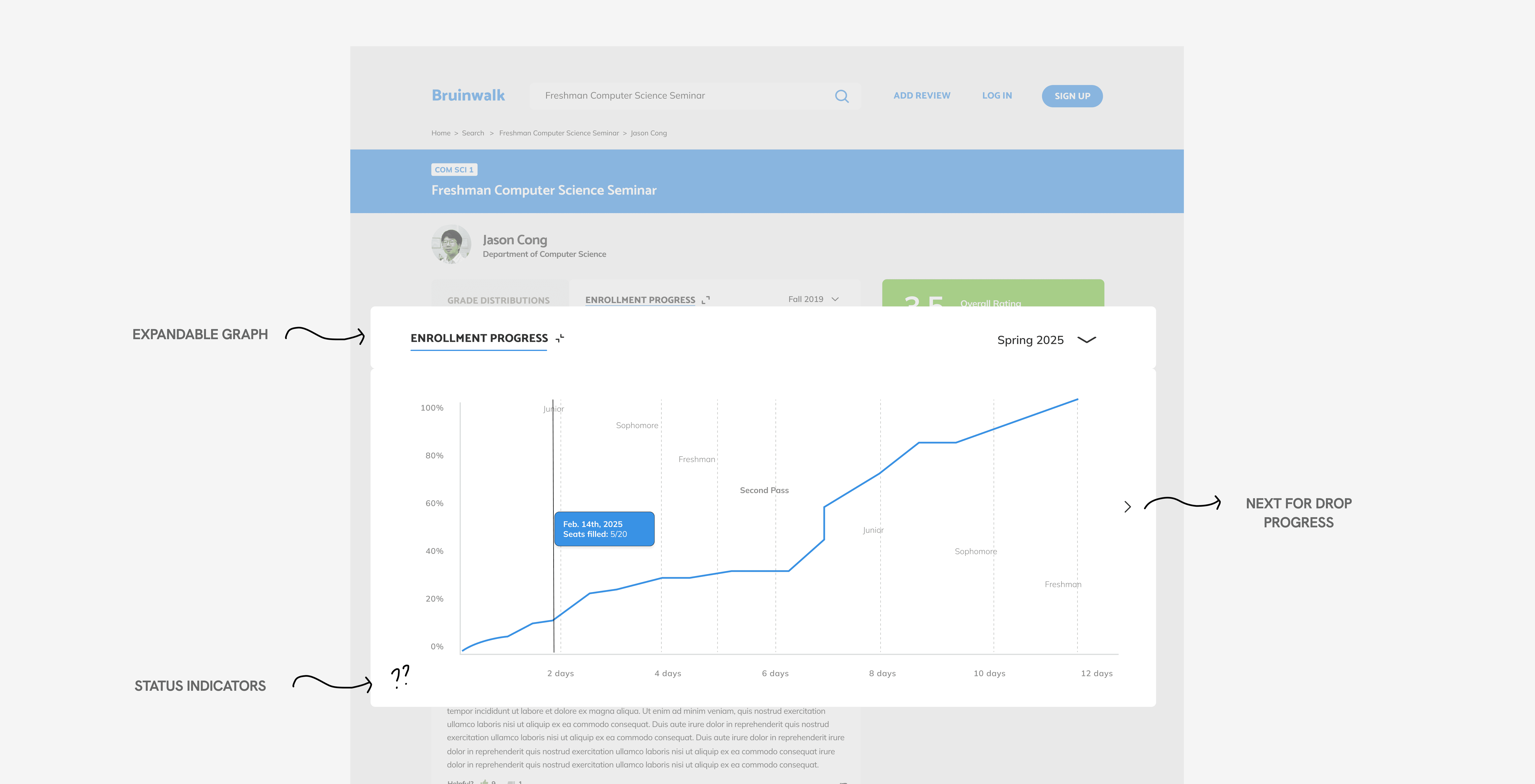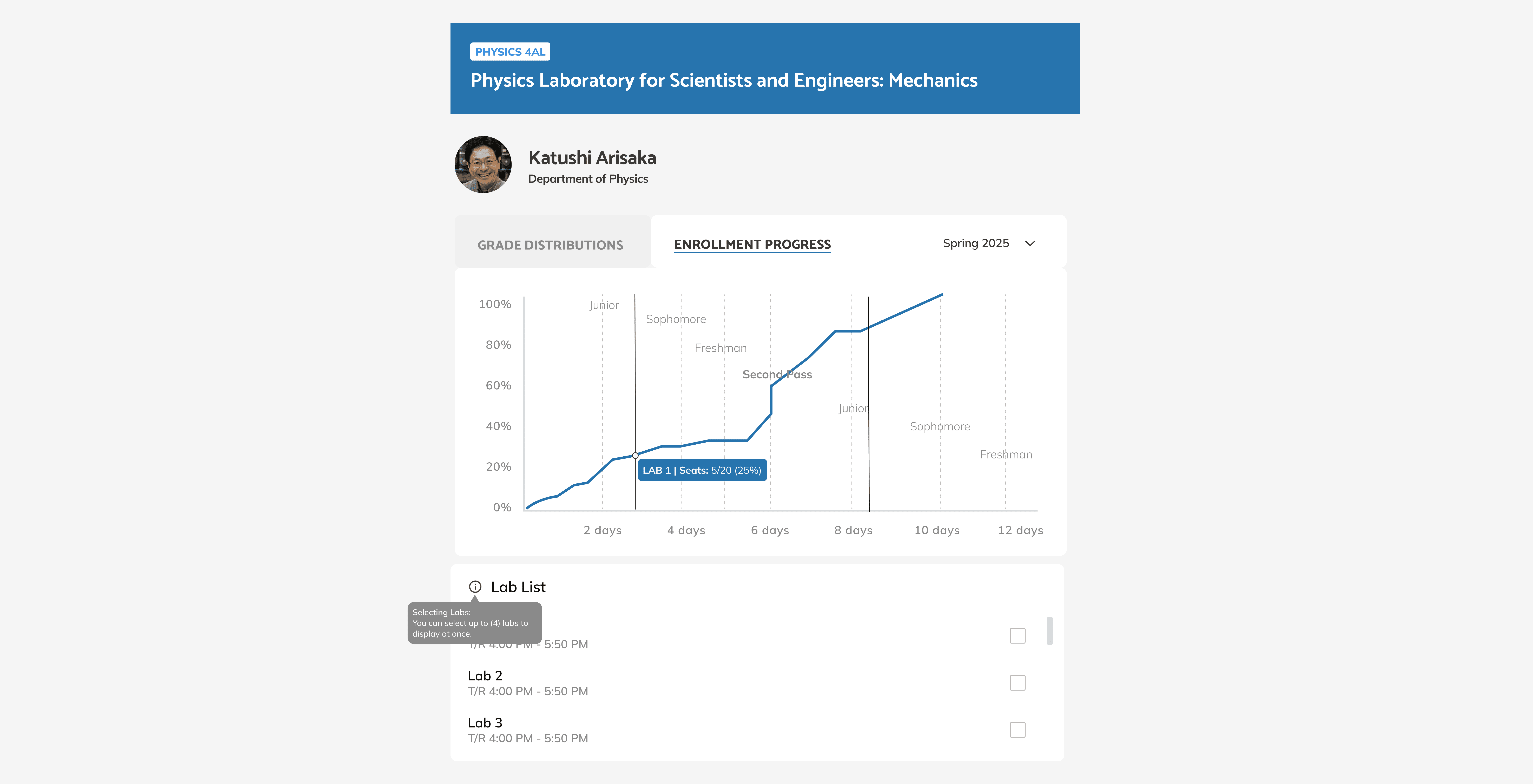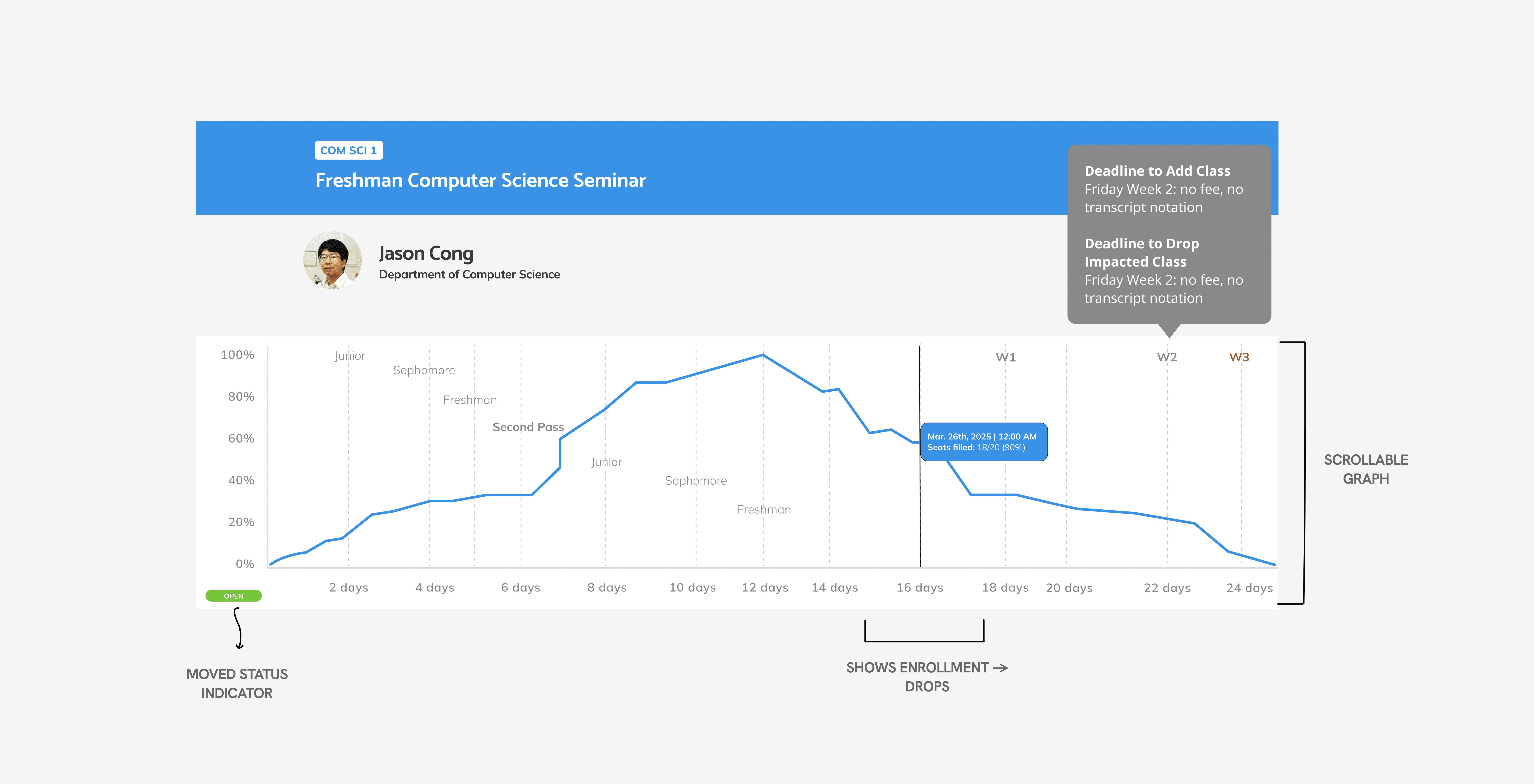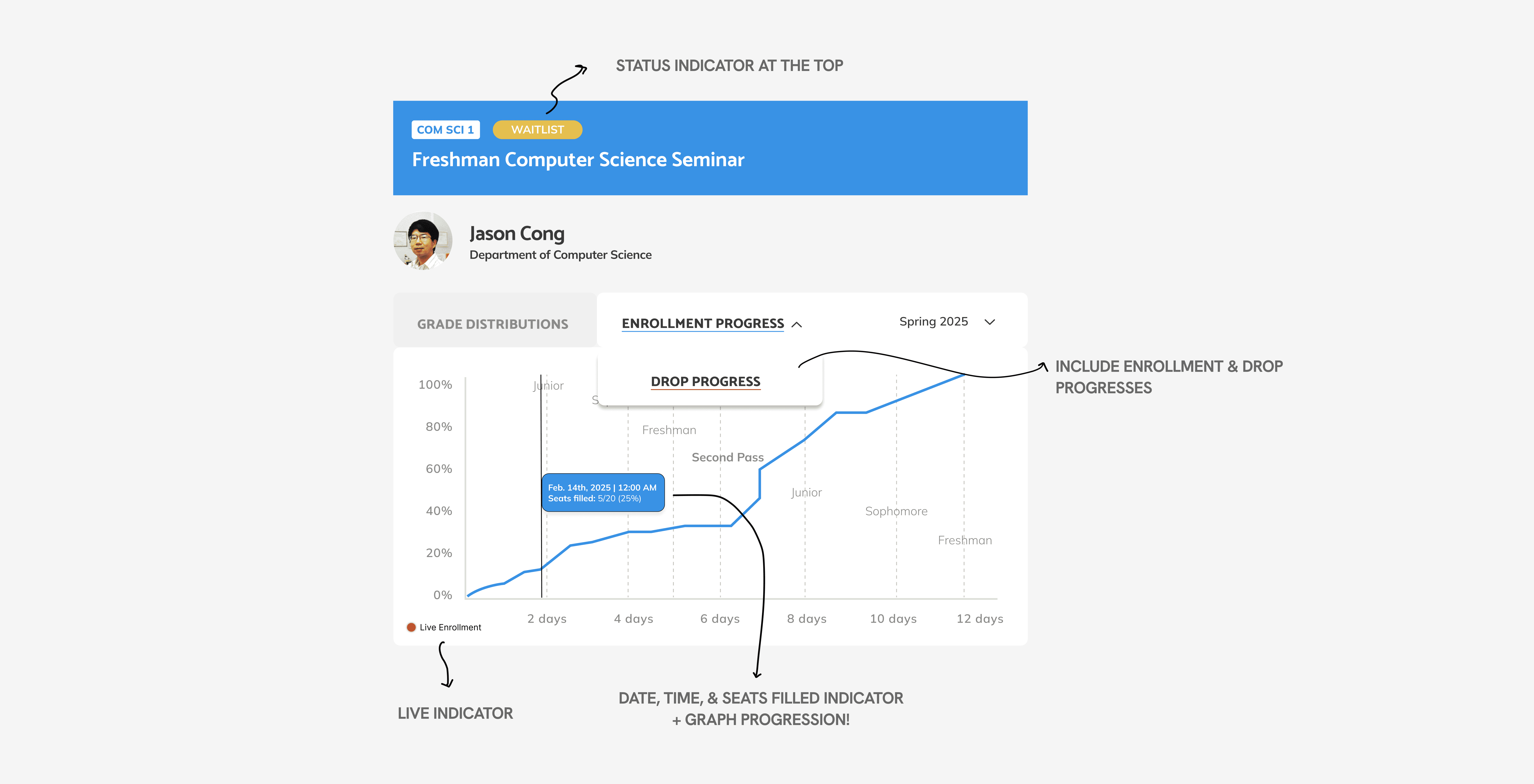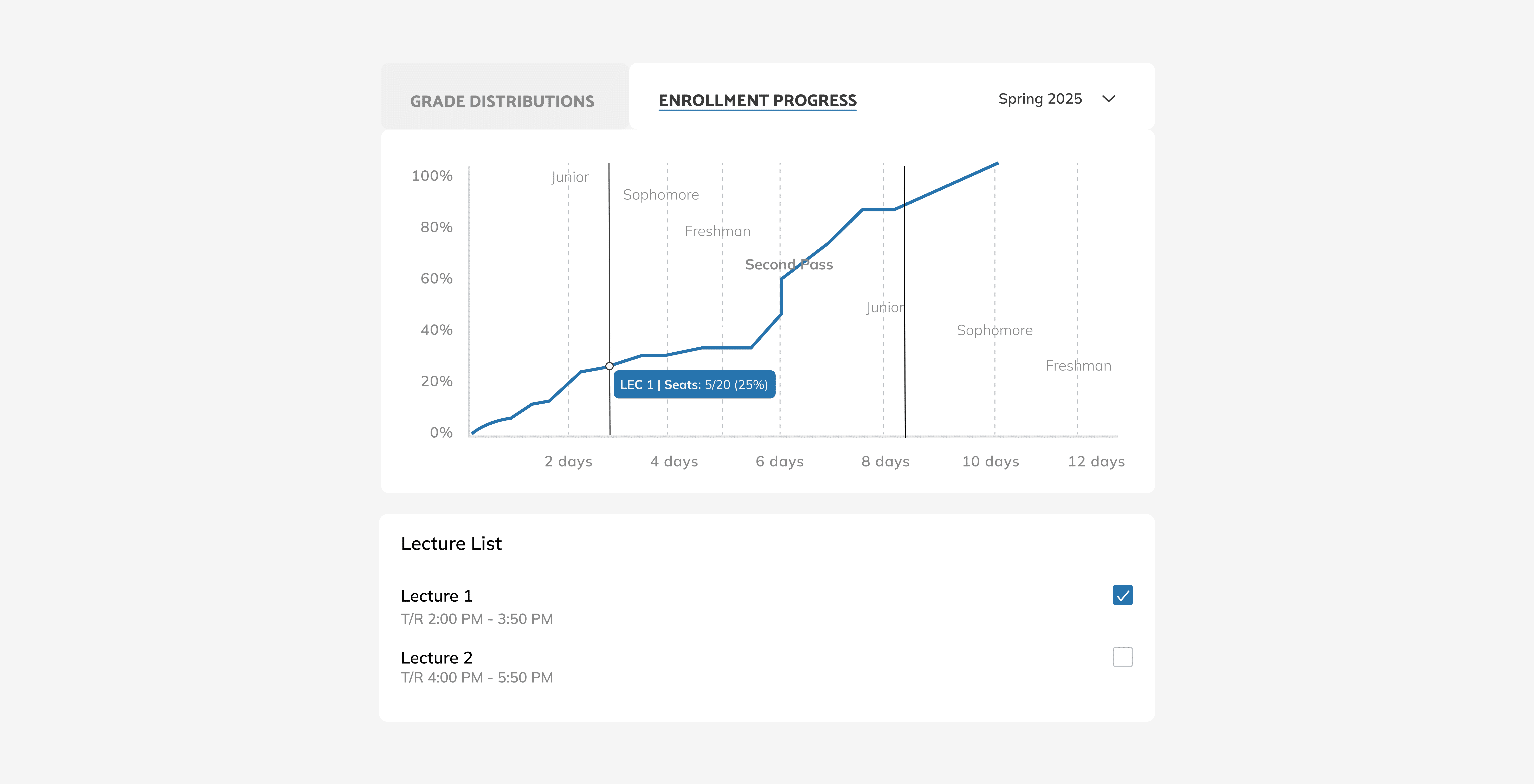 I designed a selectable lecture list that displays all the sections a professor teaches for a given course. Users can choose a specific lecture to view its live enrollment progress and even compare two sections side by side for better decision-making.