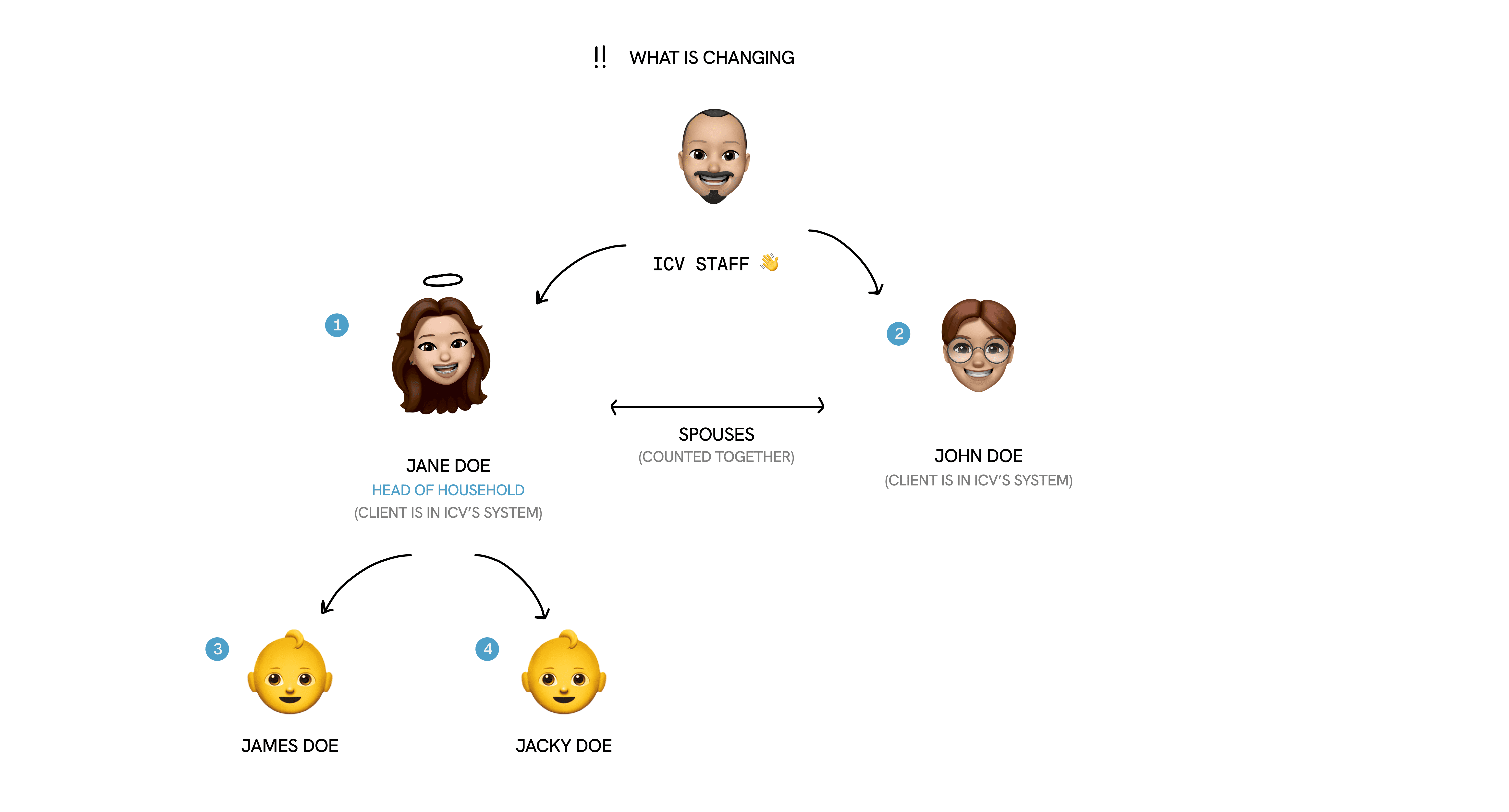 By assigning a client "Head of Household," we are able to eliminate double-counting and ensures an accurate count of the population served by ICV.