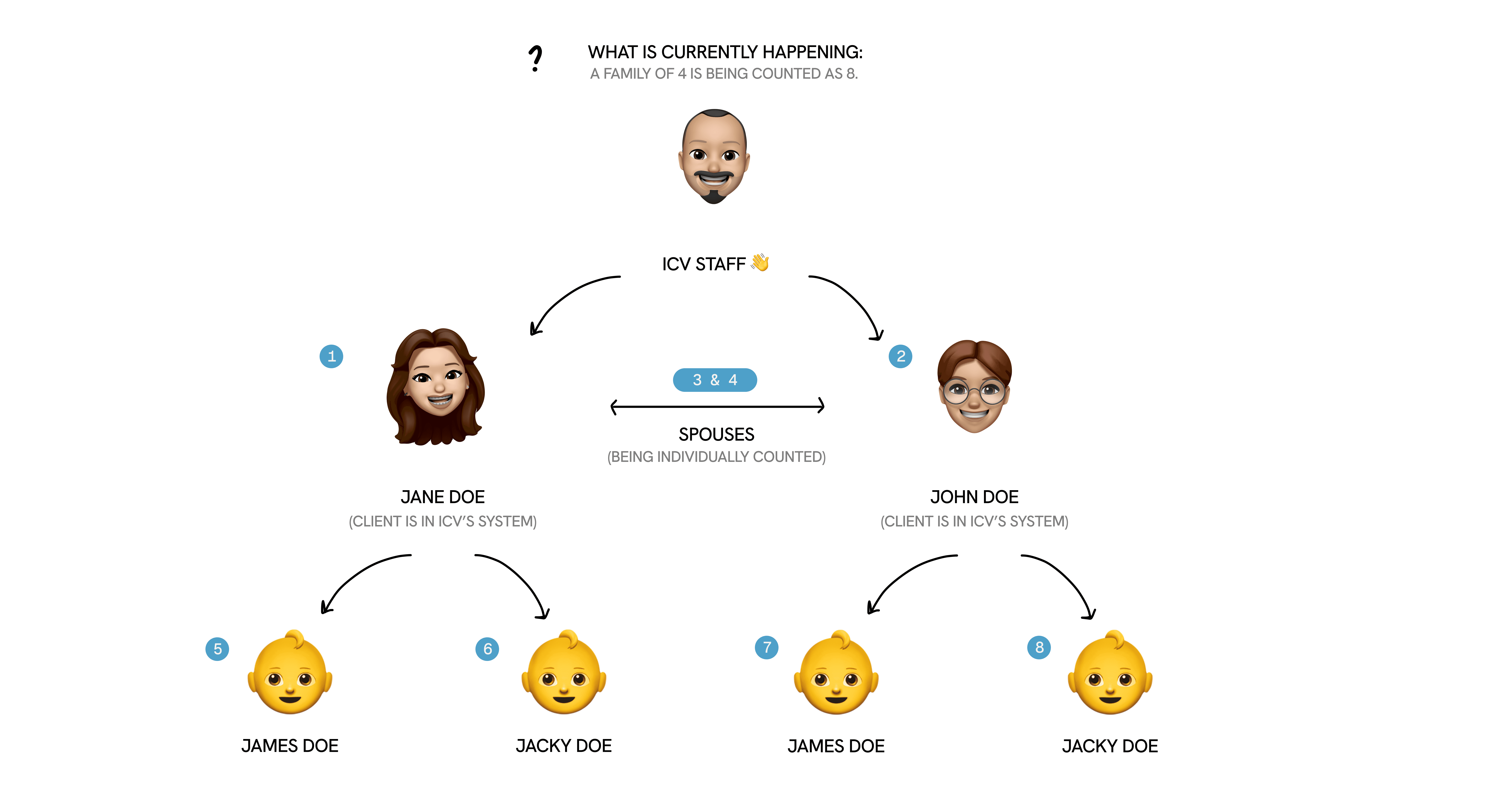 Double-counting of family members can occur when both spouses are in the ICV system—either through having their own individual profiles or by being linked to a spouse who is already in the system. This can also include double-counting of dependents, if applicable.